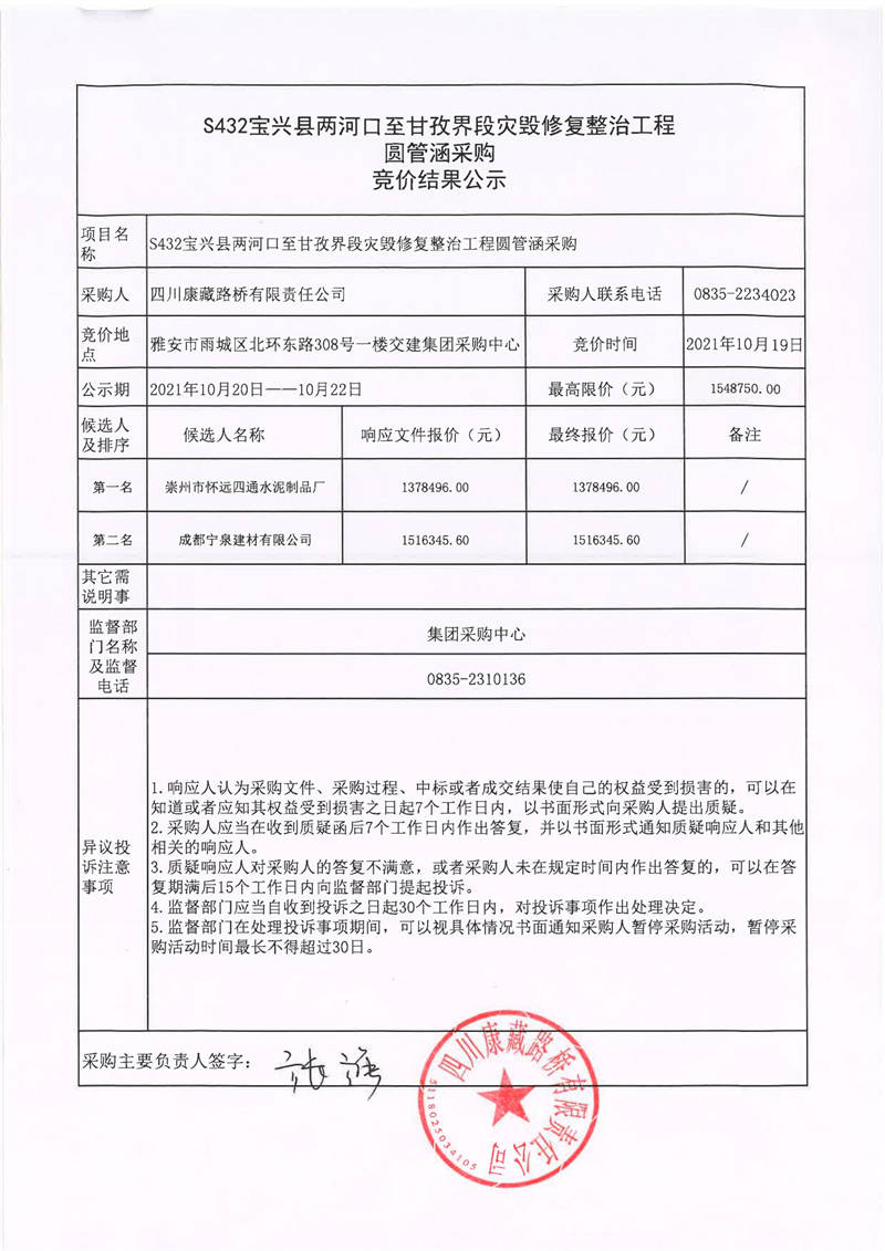 四川康藏路橋有限責(zé)任公司S432線寶興縣兩河口至甘孜界段災(zāi)毀修復(fù)整治工程圓管涵采購競價(jià)結(jié)果公示