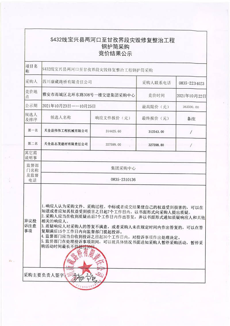 四川康藏路橋有限責(zé)任公司S432線寶興縣兩河口至甘孜界段災(zāi)毀修復(fù)整治工程鋼護(hù)筒采購(gòu)競(jìng)價(jià)結(jié)果公示
