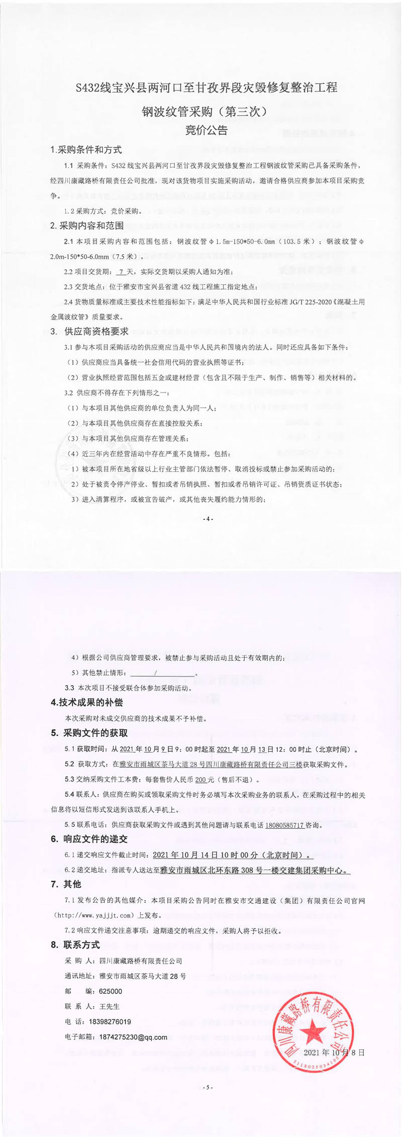 四川康藏路橋有限責(zé)任公司S432線寶興縣兩河口至甘孜界段災(zāi)毀修復(fù)整治工程鋼波紋管采購(gòu)(第三次)競(jìng)價(jià)公告