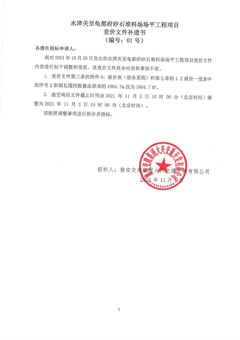 雅安交建集團(tuán)大興交通開發(fā)有限公司水津關(guān)至龜都府砂石堆料場(chǎng)場(chǎng)平工程項(xiàng)目競(jìng)價(jià)文件補(bǔ)遺書(編號(hào):01號(hào))