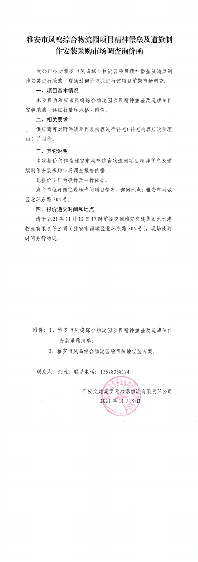 雅安交建集團無水港物流有限責任公司雅安市鳳鳴綜合物流園項目精神堡壘及道旗制作安裝采購市場調查詢價函