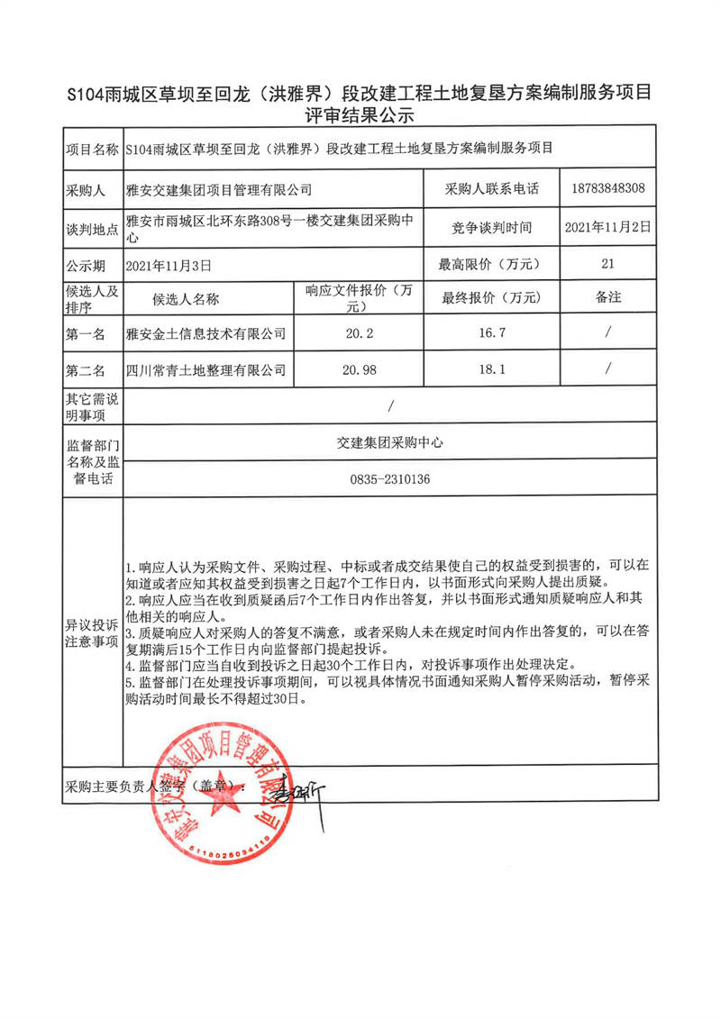 雅安交建集團項目管理有限公司S104雨城區(qū)草壩至回龍(洪雅界)段改建工程土地復墾方案編制服務項目評審結果公示