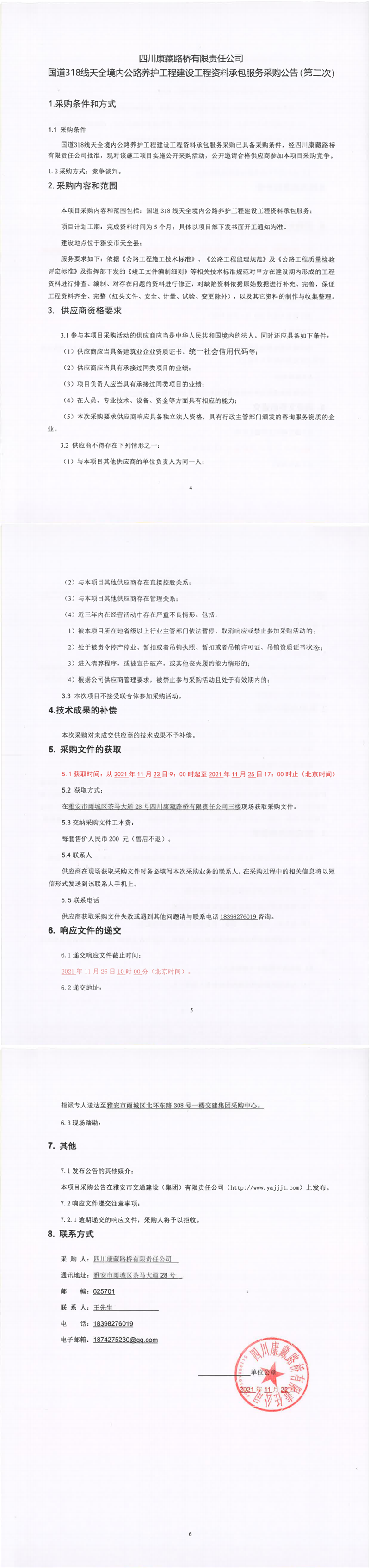 四川康藏路橋有限責(zé)任公司國(guó)道318線天全境內(nèi)公路養(yǎng)護(hù)工程建設(shè)工程資料承包服務(wù)采購公告(第二次)