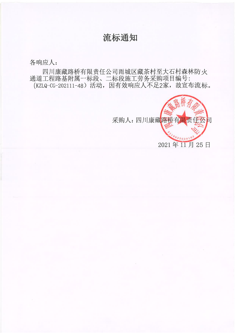 四川康藏路橋有限責(zé)任公司雨城區(qū)藏茶村至大石村森林防火通道工程路基附屬一標(biāo)段、二標(biāo)段施工勞務(wù)流標(biāo)通知