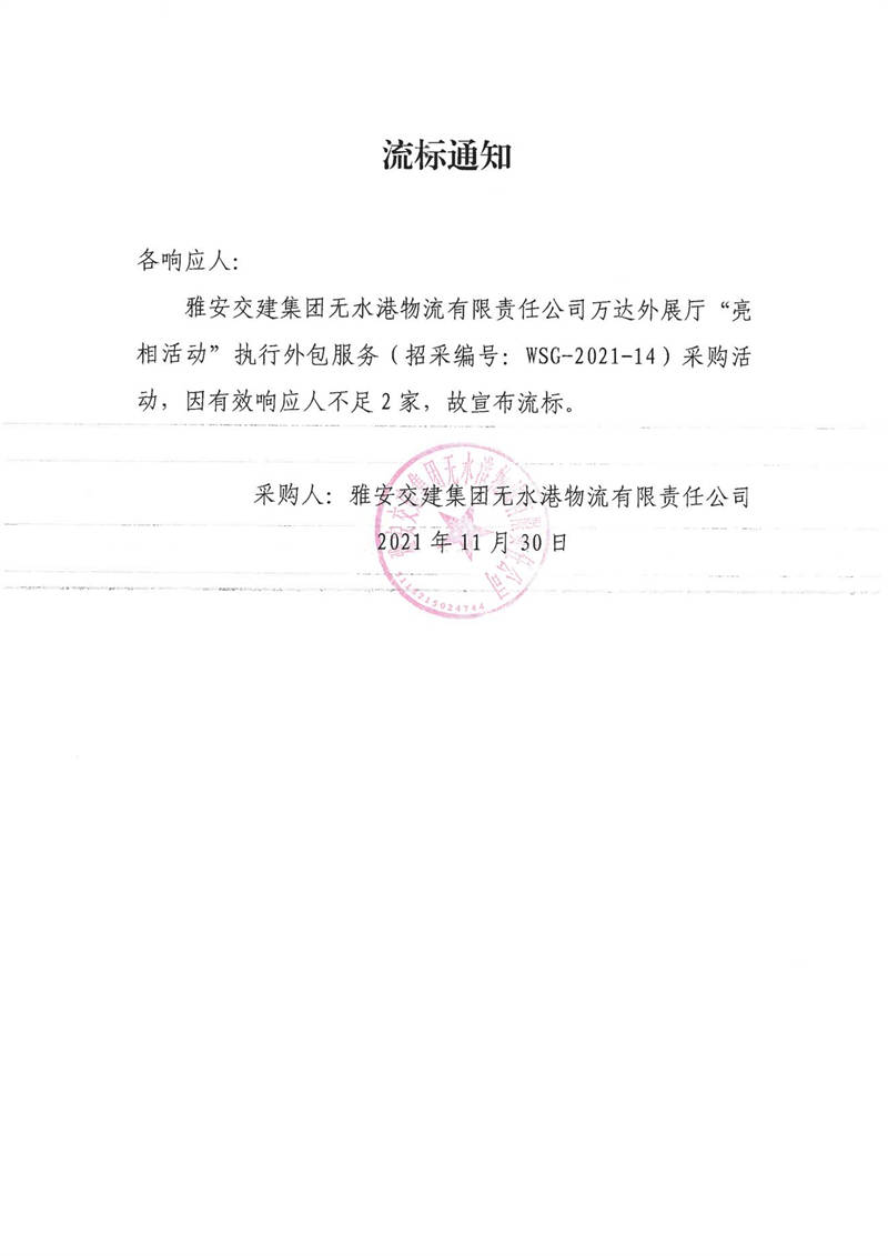 雅安交建集團無水港物流有限責(zé)任公司萬達外展廳“亮相活動”執(zhí)行外包服務(wù)流標通知