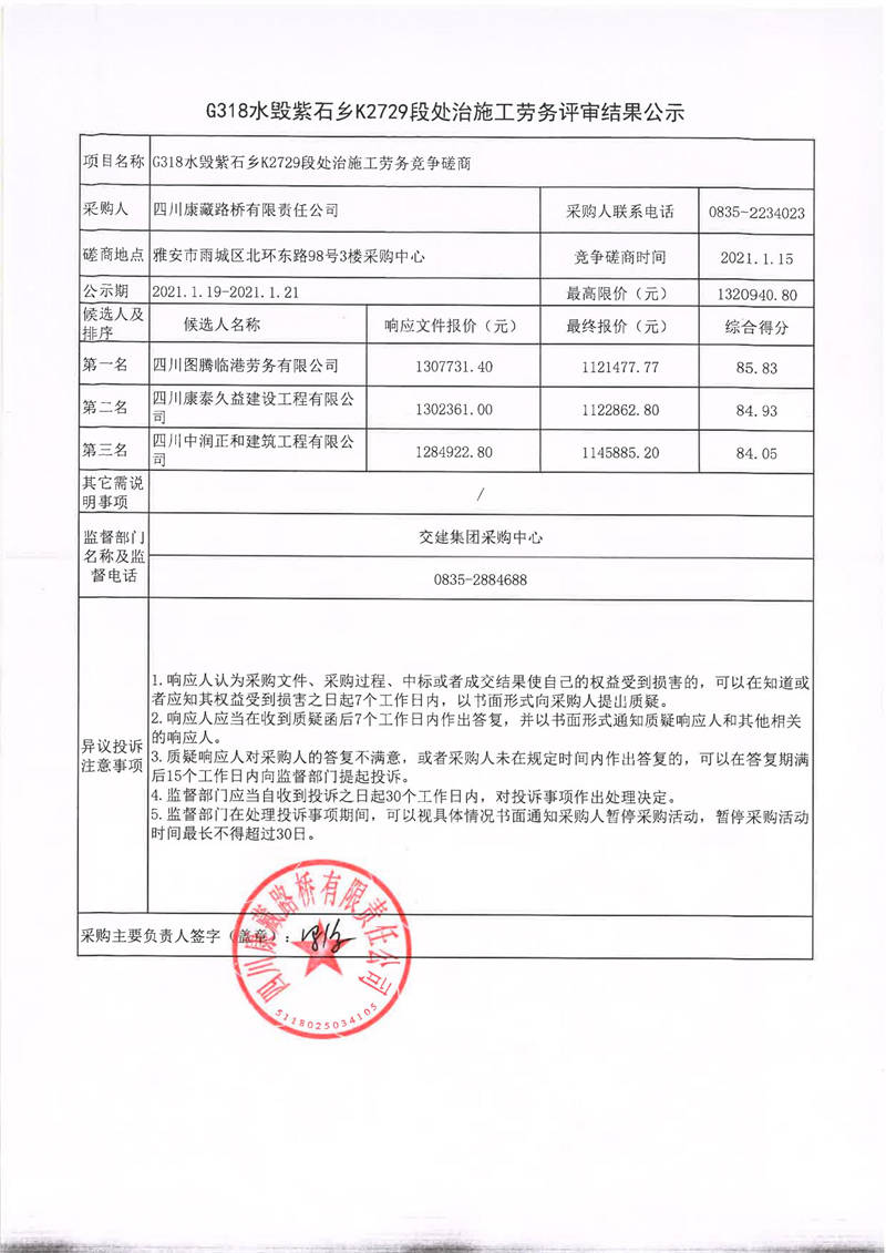 四川康藏路橋有限責任公司G318水毀紫石鄉(xiāng)K2729段處治施工勞務(wù)評審結(jié)果公示