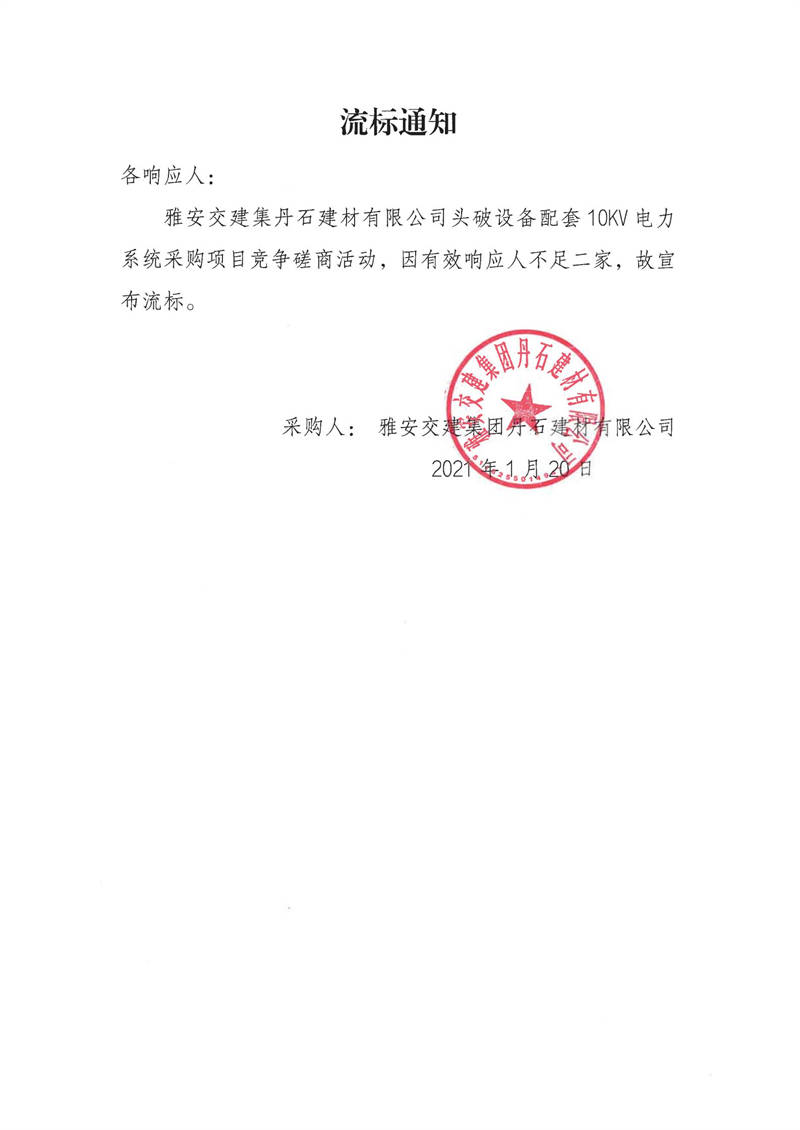 雅安交建集團丹石建材有限公司頭破設(shè)備配套10KV電力系統(tǒng)采購項目流標(biāo)通知