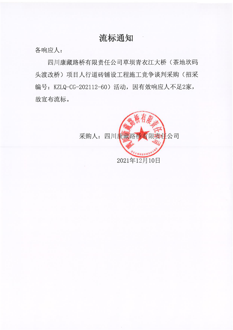 四川康藏路橋有限責任公司草壩青衣江大橋(茶地坎碼頭渡改橋)項目人行道磚鋪設工程施工競爭談判采購流標通知