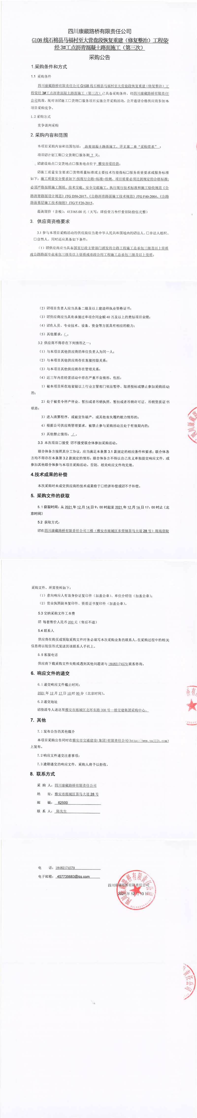 四川康藏路橋有限責(zé)任公司G108線石棉縣馬福村至大營(yíng)盤段恢復(fù)重建(修復(fù)整治)工程滎經(jīng)3#工點(diǎn)瀝青混凝土路面施工(第三次)采購(gòu)公告