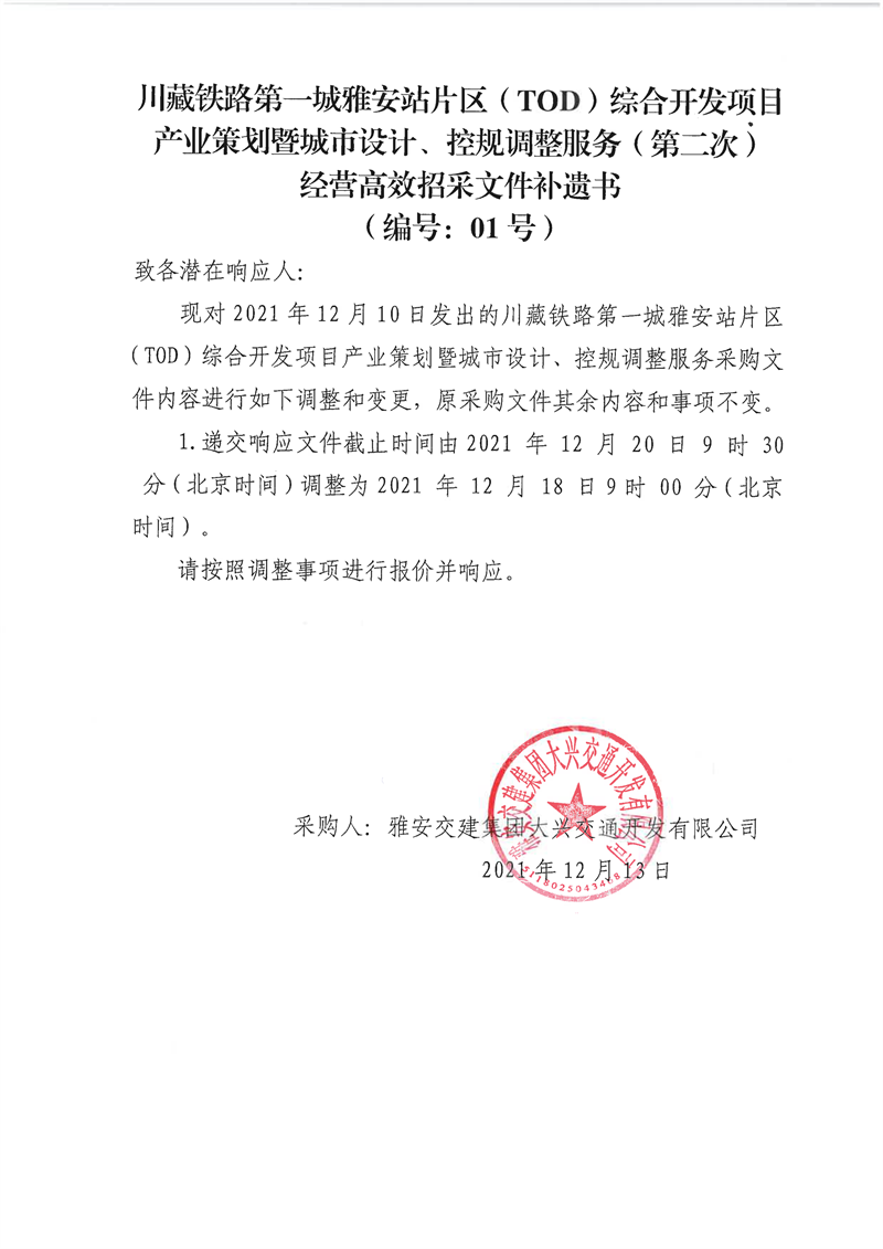 雅安交建集團(tuán)大興交通開發(fā)有限公司川藏鐵路第一城雅安站片區(qū)(TOD)綜合開發(fā)項目產(chǎn)業(yè)策劃暨城市設(shè)計、控規(guī)調(diào)整服務(wù)(第二次)經(jīng)營高效招采文件補(bǔ)遺書(編號:01號)