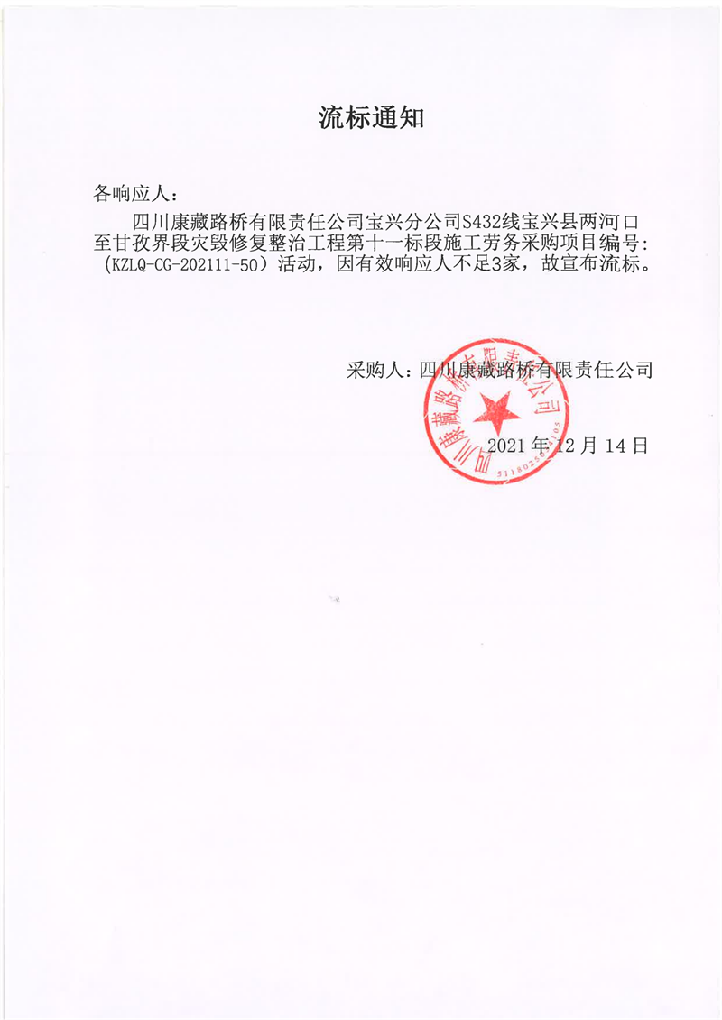 S432線寶興縣兩河口至甘孜界段災毀修復整治工程第十一標段施工勞務(第二次)流標通知