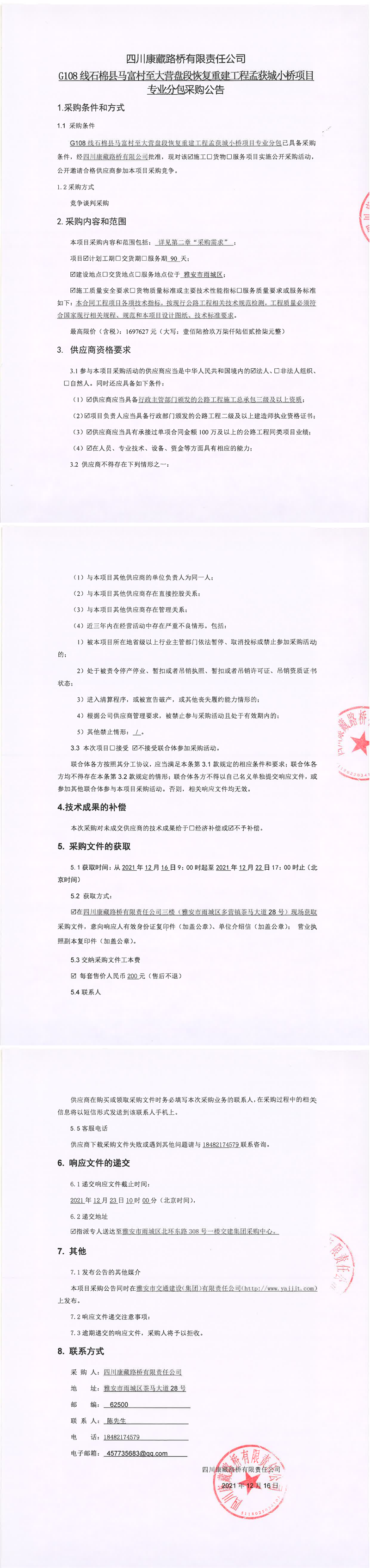 四川康藏路橋有限責(zé)任公司G108線石棉縣馬富村至大營(yíng)盤(pán)段恢復(fù)重建工程孟獲城小橋項(xiàng)目專(zhuān)業(yè)分包采購(gòu)公告