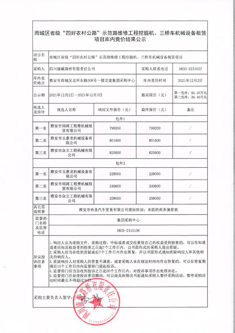 四川康藏路橋有限責任公司雨城區(qū)省級“四好農(nóng)村路”示范路維修工程挖掘機、三橋車機械設備租賃項目庫內(nèi)競價結(jié)果公示