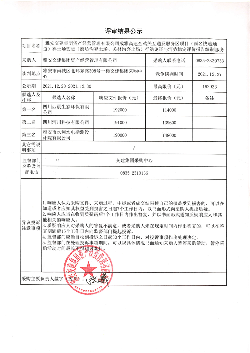 雅安交建集團(tuán)資產(chǎn)經(jīng)營管理有限公司成雅高速金雞關(guān)互通及服務(wù)區(qū)項(xiàng)目(雨名快速通道)棄土場(chǎng)變更(磨坊溝棄土場(chǎng)、關(guān)材溝棄土場(chǎng))行洪論證與河勢(shì)穩(wěn)定評(píng)價(jià)報(bào)告編制服務(wù)評(píng)審結(jié)果公示