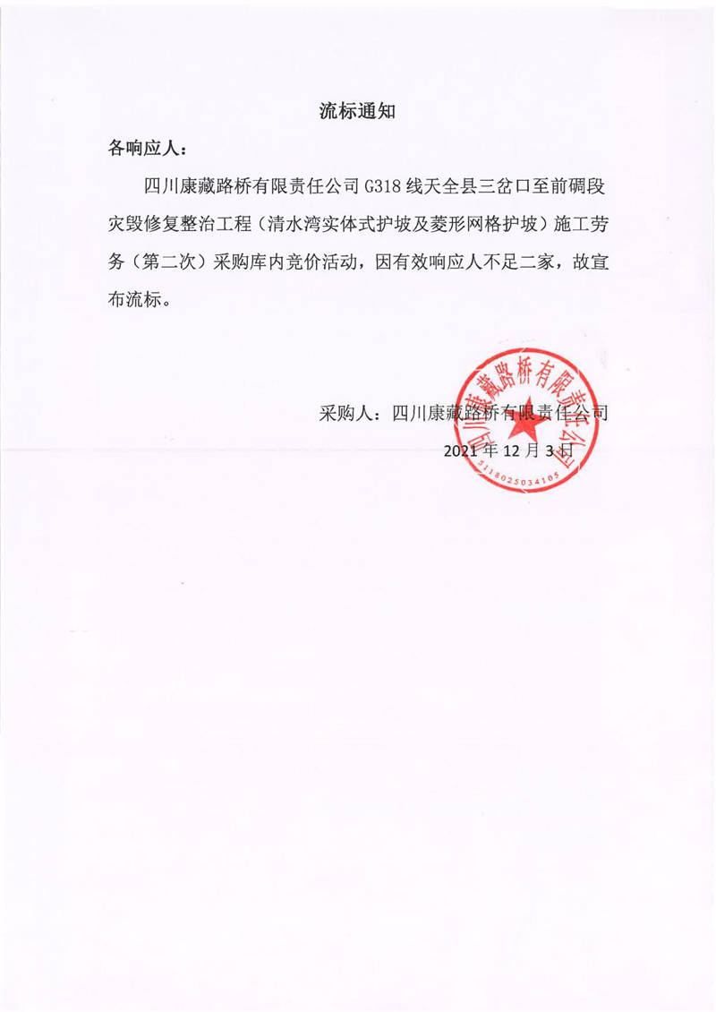 四川康藏路橋有限責任公司G318線天全縣三岔口至前碉段災毀修復整治工程(清水灣實體式護坡及菱形網格護坡)施工勞務(第二次)采購流標通知