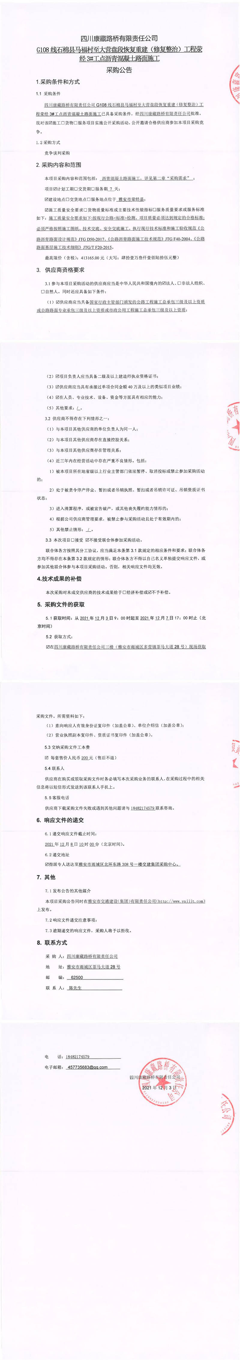 四川康藏路橋有限責任公司G108線石棉縣馬福村至大營盤段恢復重建(修復整治)工程滎經(jīng)3#工點瀝青混凝土路面施工采購公告