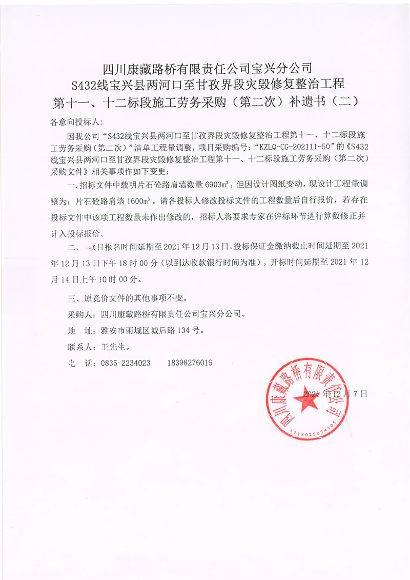 四川康藏路橋有限責(zé)任公司寶興分公司S432線(xiàn)寶興縣兩河口至甘孜界段災(zāi)毀修復(fù)整治工程第十一、十二標(biāo)段施工勞務(wù)采購(gòu)(第二次)補(bǔ)遺書(shū)(二)