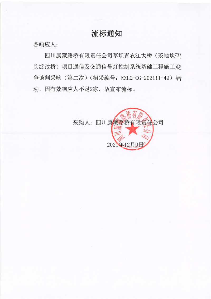 四川康藏路橋有限責(zé)任公司草壩青衣江大橋(茶地坎碼頭渡改橋)項目通信及交通信號燈控制系統(tǒng)基礎(chǔ)工程施工競爭談判采購(第二次)流標通知