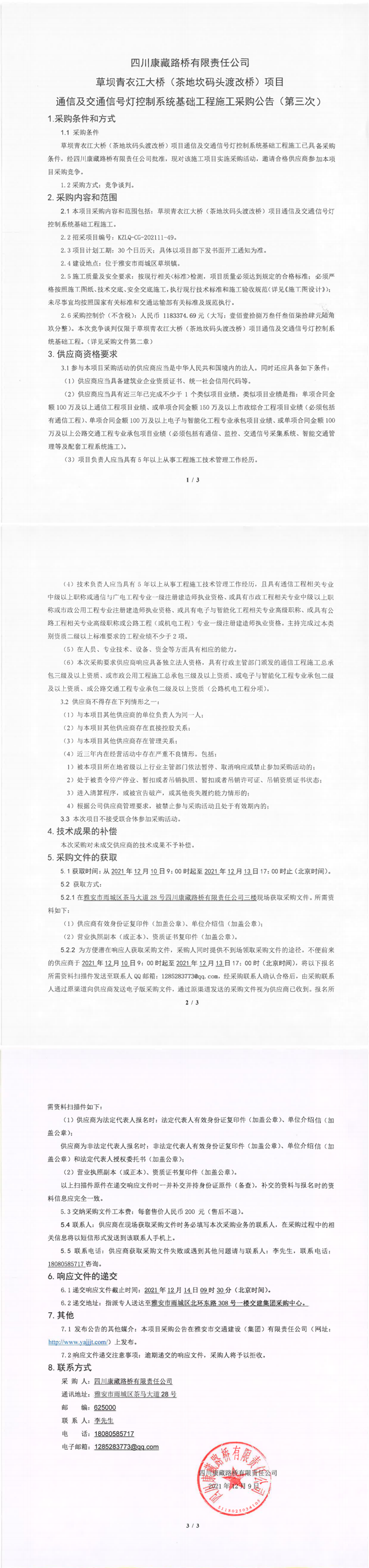 四川康藏路橋有限責(zé)任公司草壩青衣江大橋(茶地坎碼頭渡改橋)項目通信及交通信號燈控制系統(tǒng)基礎(chǔ)工程施工采購公告(第三次)