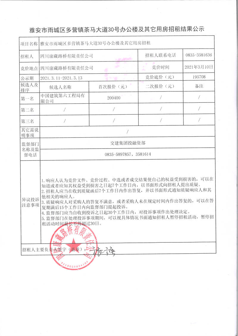 四川康藏路橋有限責(zé)任公司雅安市雨城區(qū)多營鎮(zhèn)茶馬大道30號辦公樓及其它用房招租結(jié)果公示