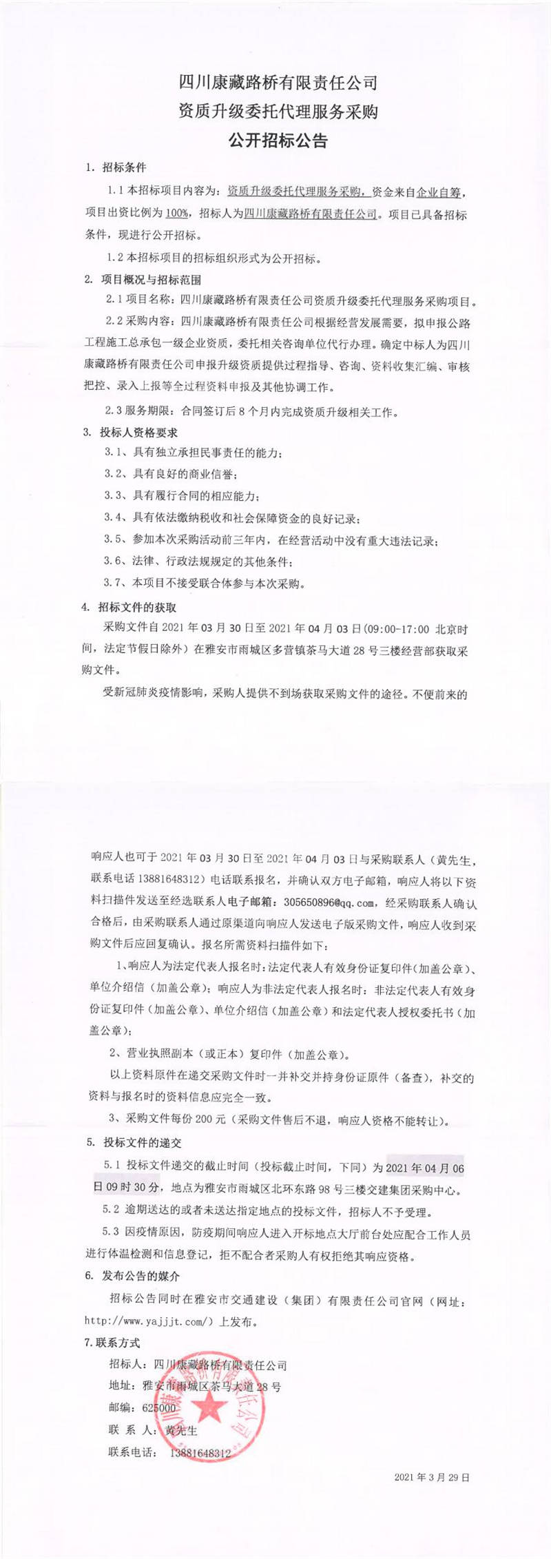 四川康藏路橋有限責任公司資質升級委托代理服務采購公開招標公告
