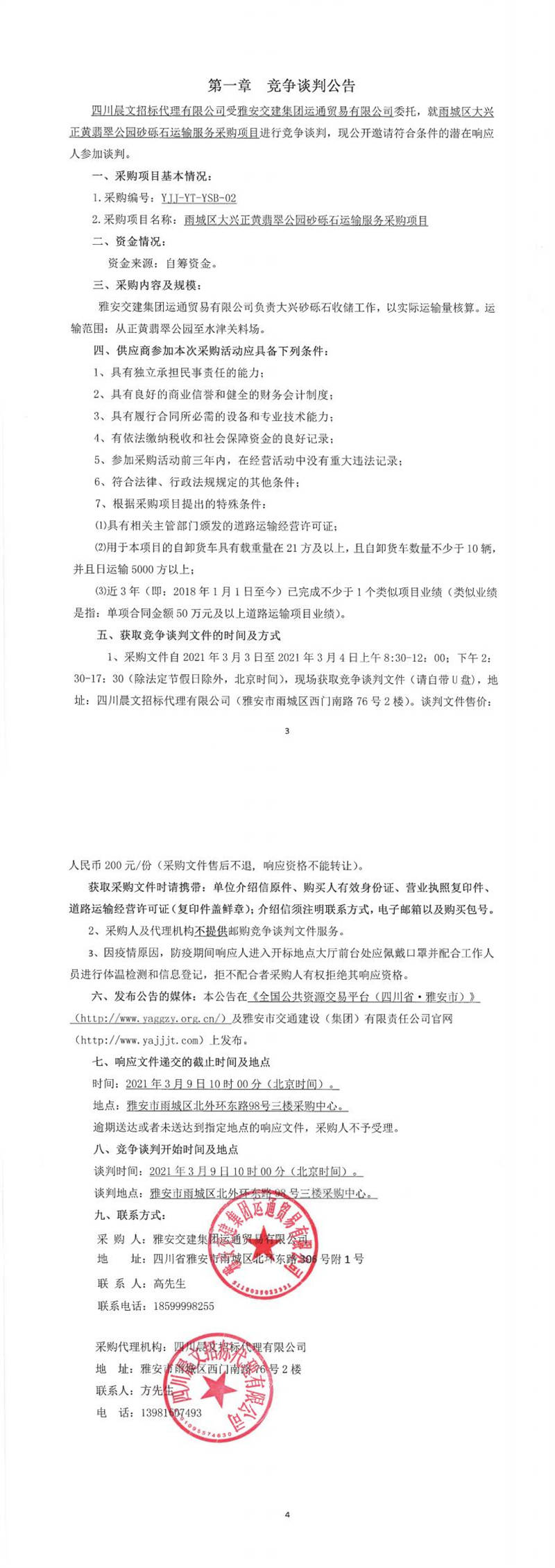雅安交建集團(tuán)運通貿(mào)易有限公司雨城區(qū)大興正黃翡翠公園砂礫石運輸服務(wù)采購項目競爭談判公告