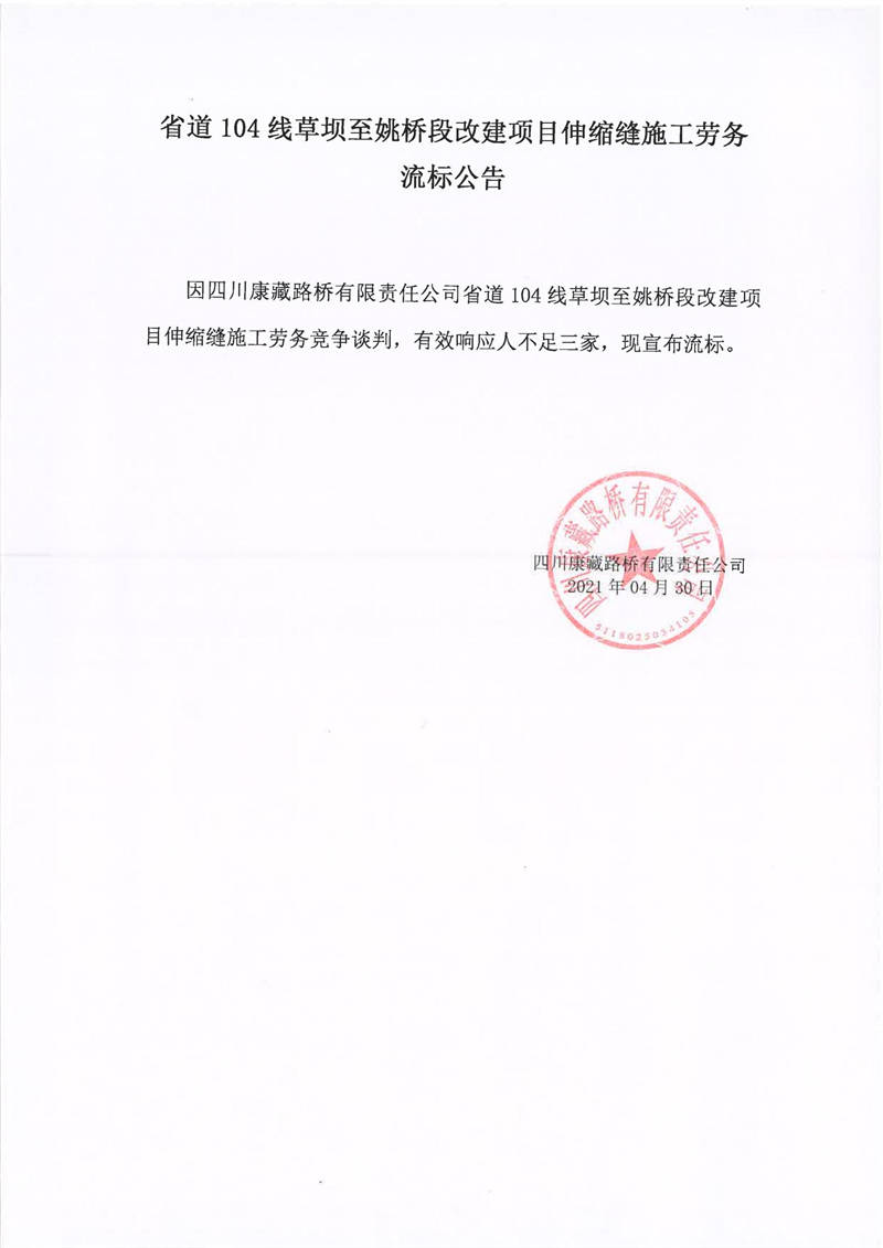 四川康藏路橋有限責(zé)任公司省道104線草壩至姚橋段改建項(xiàng)目伸縮縫施工勞務(wù)流標(biāo)公告
