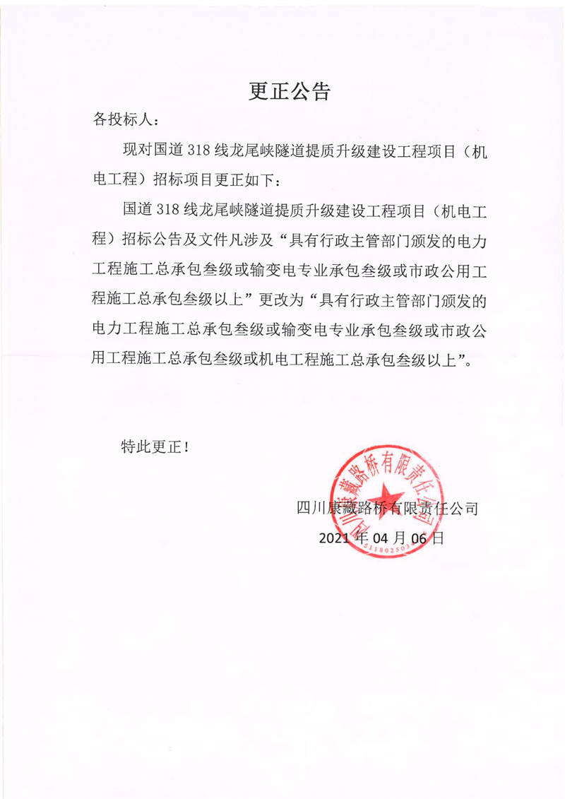 四川康藏路橋有限責(zé)任公司國(guó)道318線(xiàn)龍尾峽隧道提質(zhì)升級(jí)建設(shè)工程項(xiàng)目(機(jī)電工程)更正公告
