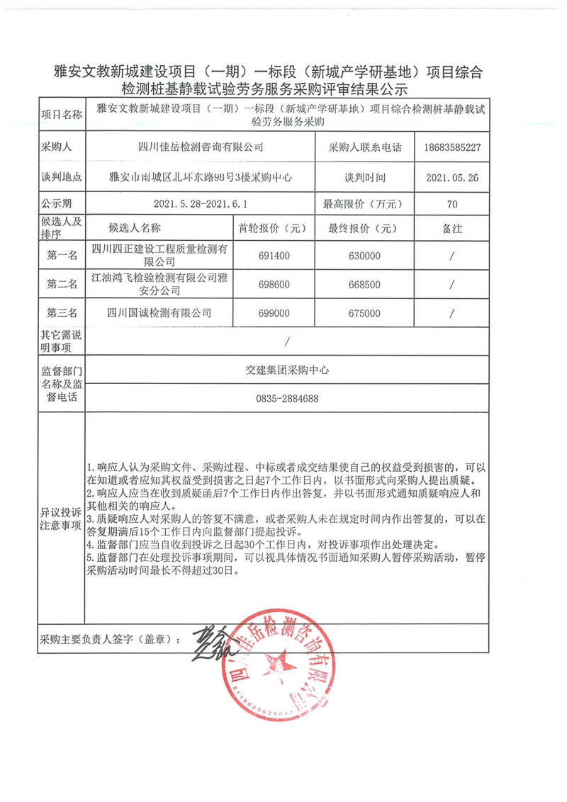四川佳岳檢測咨詢有限公司雅安文教新城建設項目(一期)一標段(新城產(chǎn)學研基地)項目綜合檢測樁基靜載試驗勞務服務采購評審結(jié)果公示