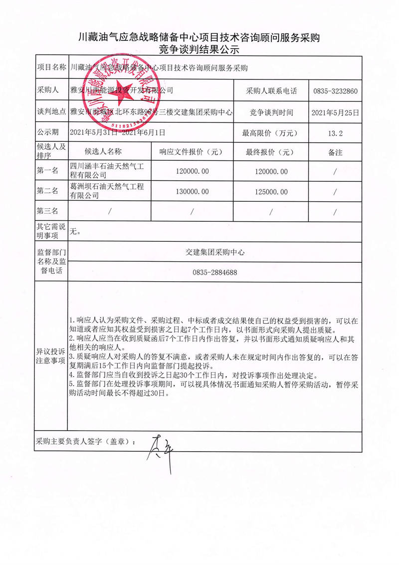 雅安川西能源投資開(kāi)發(fā)有限公司川藏油氣應(yīng)急戰(zhàn)略儲(chǔ)備中心項(xiàng)目技術(shù)咨詢顧問(wèn)服務(wù)采購(gòu)競(jìng)爭(zhēng)談判結(jié)果公示
