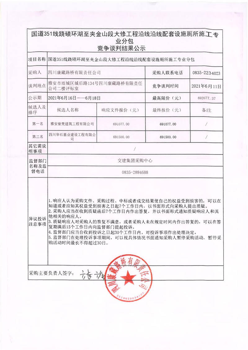 四川康藏路橋有限責任公司國道351線蹺磧環(huán)湖至夾金山段大修工程沿線沿線配套設(shè)施廁所施工專業(yè)分包競爭談判結(jié)果公示