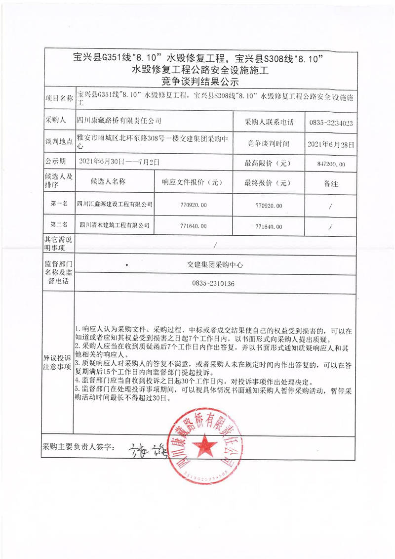 四川康藏路橋有限責任公司寶興縣G351線“8.10”水毀修復工程,寶興縣S308線水毀修復工程公路安全設施施工競爭談判結(jié)果公示
