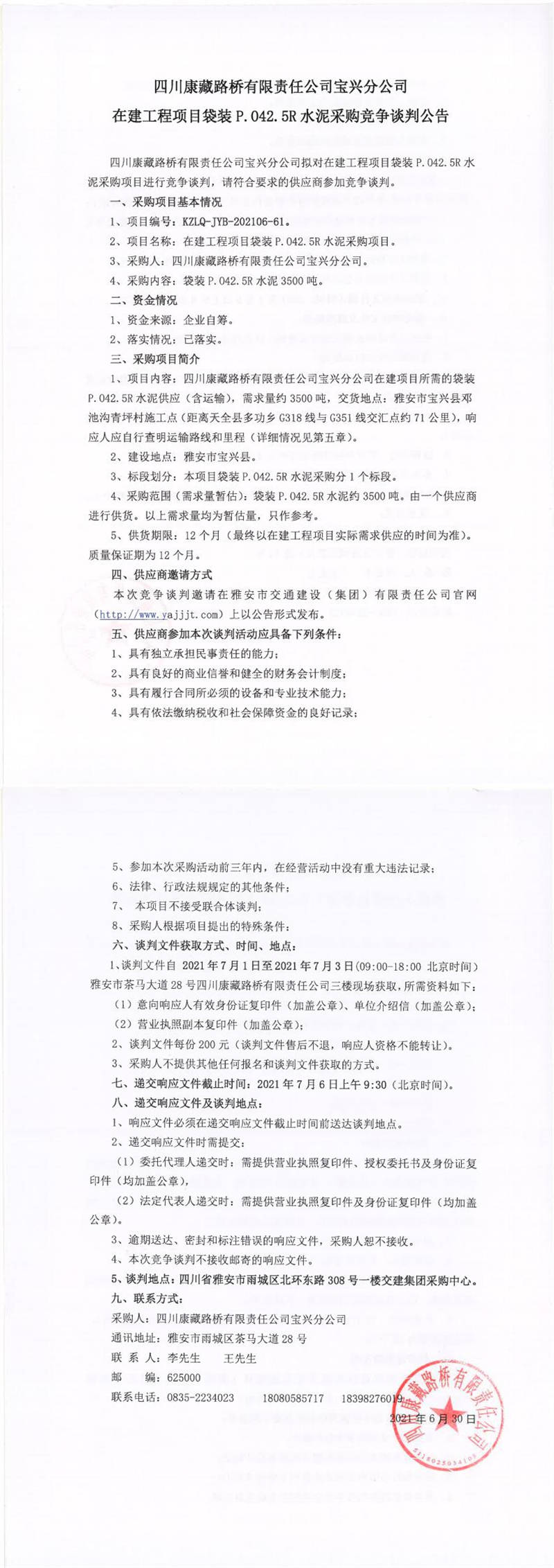 四川康藏路橋有限責(zé)任公司寶興分公司在建工程項(xiàng)目袋裝P.042.5R水泥采購(gòu)競(jìng)爭(zhēng)談判公告
