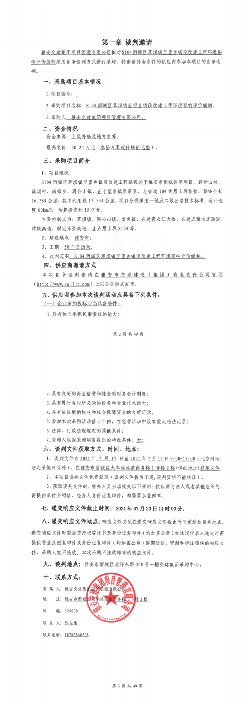 雅安交建集團(tuán)項(xiàng)目管理有限公司S104雨城區(qū)草壩鎮(zhèn)至望魚(yú)段改建工程環(huán)境影響評(píng)價(jià)編制競(jìng)爭(zhēng)談判公告
