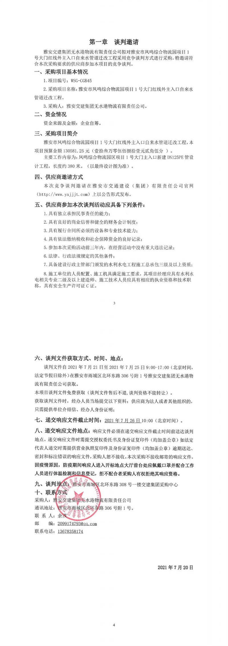 雅安交建集團(tuán)無水港物流有限責(zé)任公司雅安市鳳鳴綜合物流園項(xiàng)目1號(hào)大門紅線外主入口自來水管道遷改工程競爭談判公告