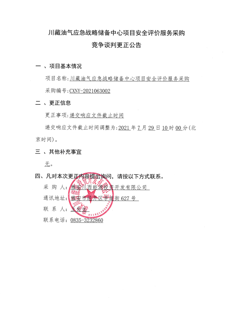 雅安川西能源投資開發(fā)有限公司川藏油氣應(yīng)急戰(zhàn)略儲備中心項目安全評價服務(wù)采購競爭談判更正公告