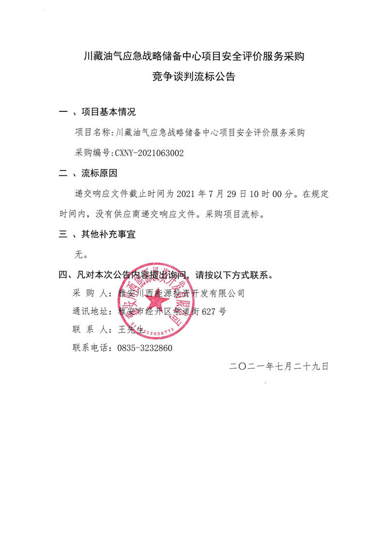 雅安川西能源投資開發(fā)有限公司川藏油氣應(yīng)急戰(zhàn)略儲(chǔ)備中心項(xiàng)目安全評價(jià)服務(wù)采購競爭談判流標(biāo)公告