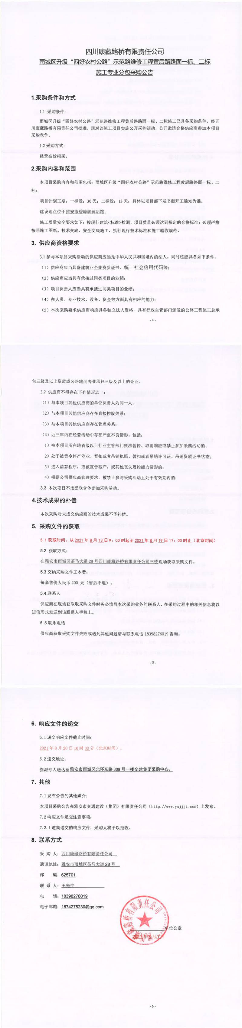 四川康藏路橋有限責(zé)任公司雨城區(qū)升級(jí)“四好農(nóng)材公路”示范路維修工程黃后路路面一標(biāo)、二標(biāo)施工專(zhuān)業(yè)分包采購(gòu)公告
