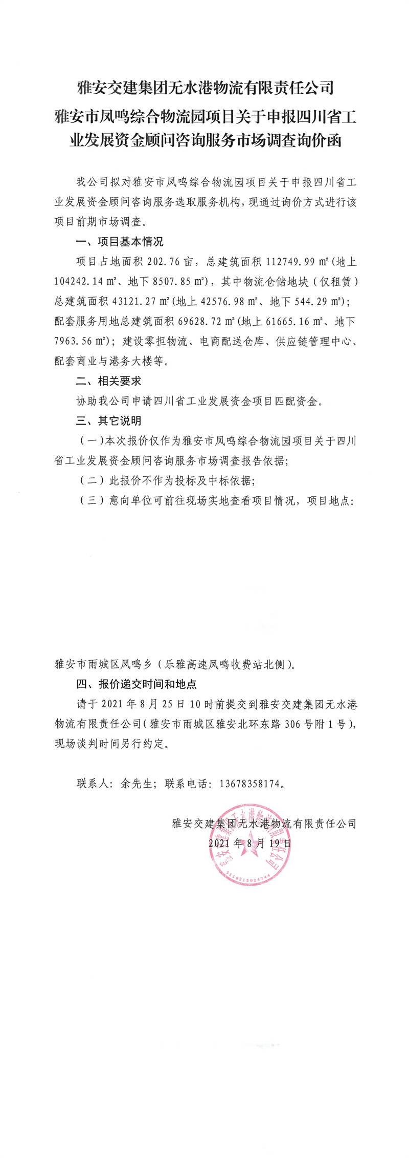 雅安交建集團無水港物流有限責(zé)任公司雅安市鳳鳴綜合物流園項目關(guān)于申報四川省工業(yè)發(fā)展資金顧問咨詢服務(wù)市場調(diào)查詢價函