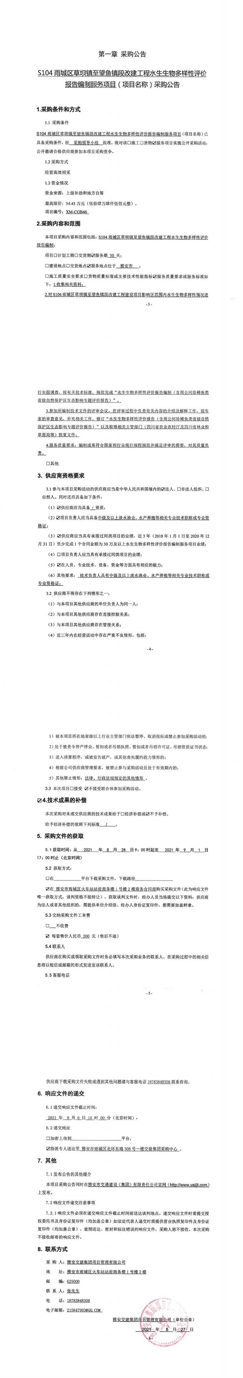 雅安交建集團(tuán)項(xiàng)目管理有限公司S104雨城區(qū)草壩鎮(zhèn)至望魚鎮(zhèn)段改建工程水生生物多樣性評(píng)價(jià)報(bào)告編制服務(wù)項(xiàng)目采購公告