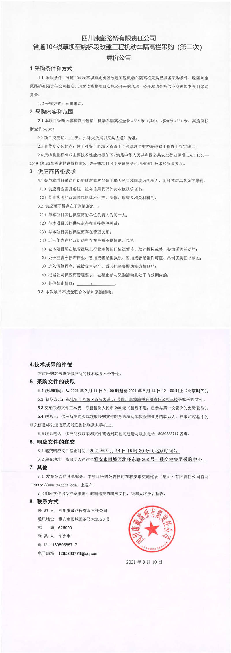 四川康藏路橋有限責(zé)任公司省道104線草壩至姚橋段改建工程機(jī)動(dòng)車隔離欄采購(第二次)競(jìng)價(jià)公告