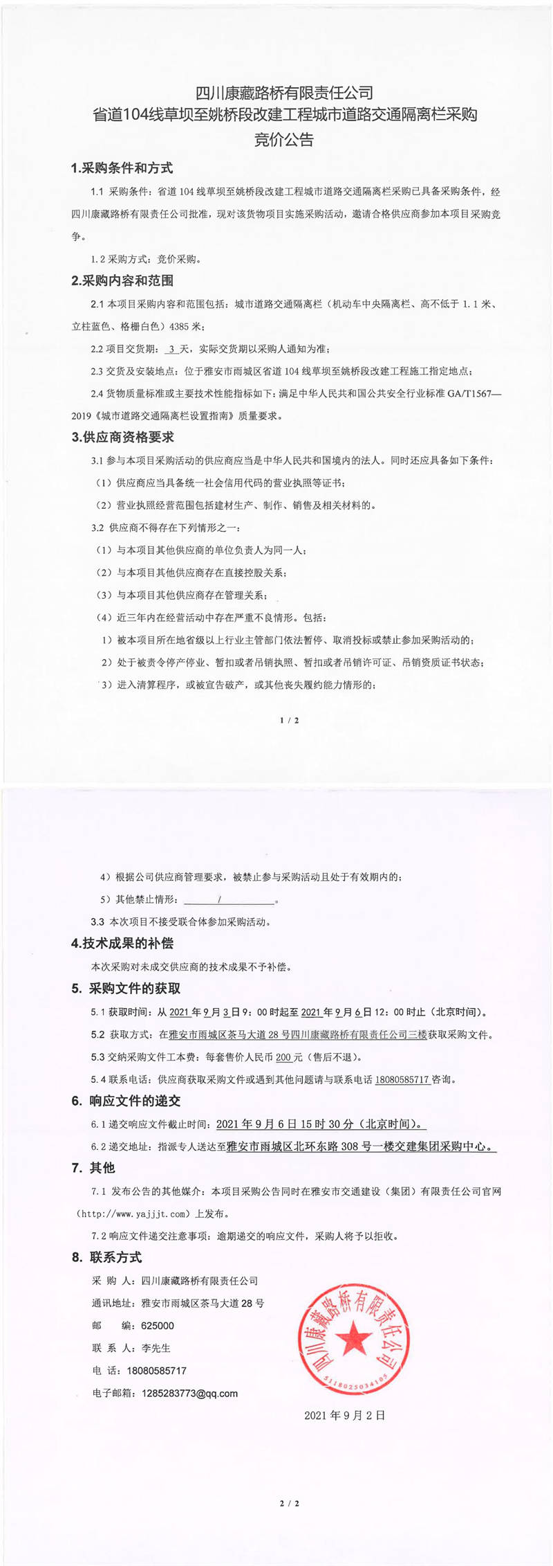 四川康藏路橋有限責(zé)任公司省道104線草壩至姚橋段改建工程城市道路交通隔離欄采購(gòu)競(jìng)價(jià)公告