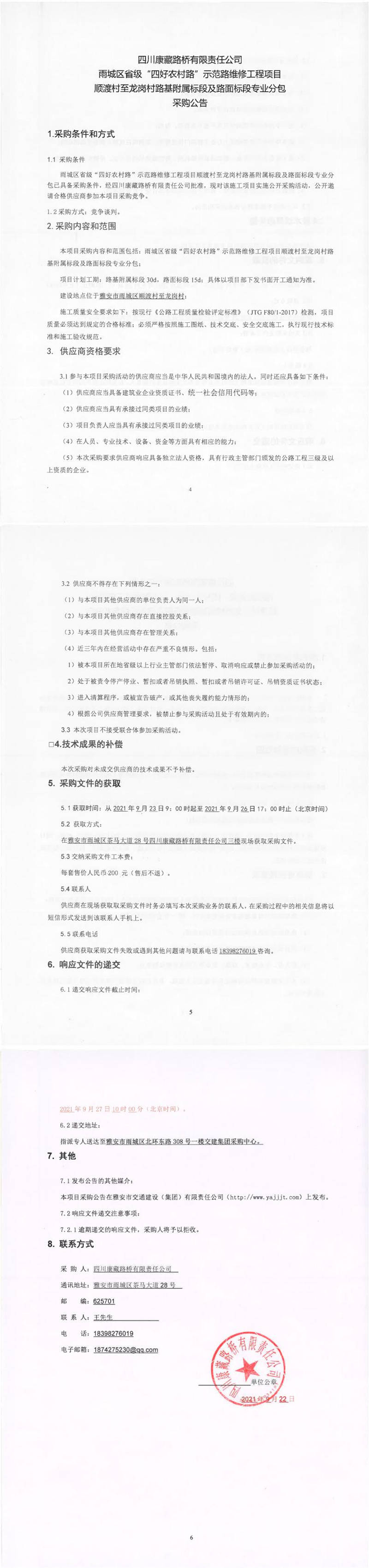 四川康藏路橋有限責任公司雨城區(qū)省級“四好農村路”示范路維修工程項目順渡村至龍崗村路基附屬標段及路面標段專業(yè)分包采購公告