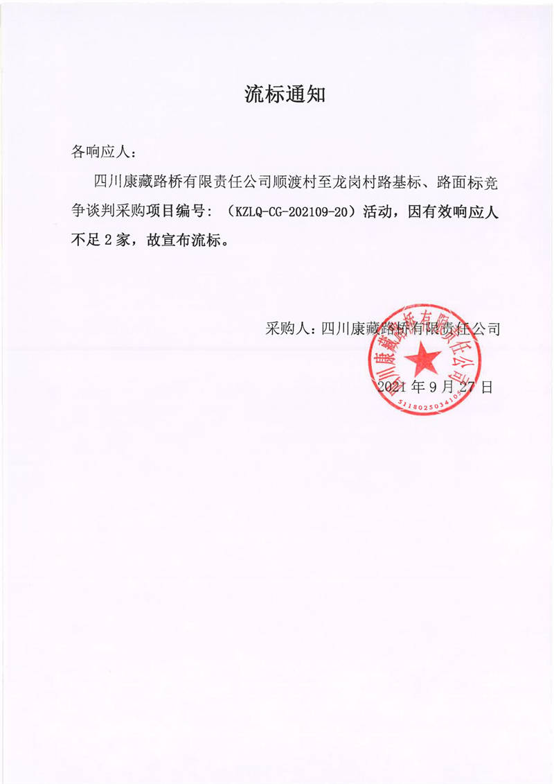 四川康藏路橋有限責任公司順渡村至龍崗村路基標、路面標競爭談判采購項目流標通知