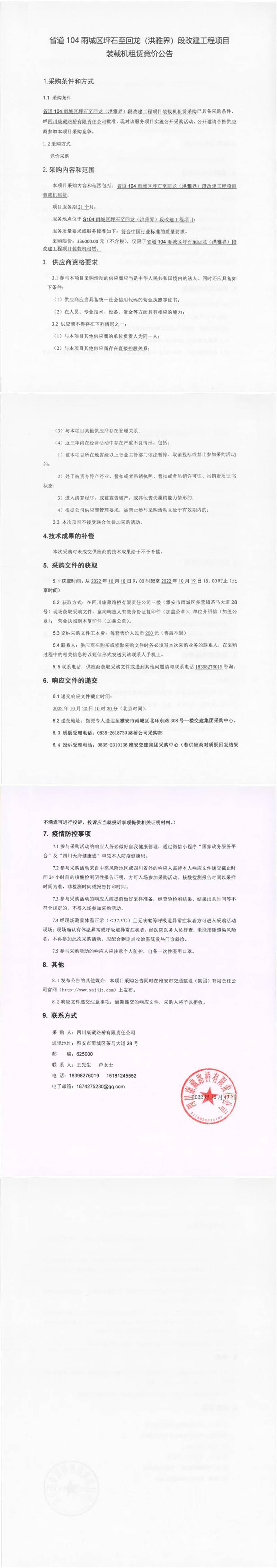 四川康藏路橋有限責(zé)任公司省道104雨城區(qū)坪石至回龍(洪雅界)段改建工程項(xiàng)目裝載機(jī)租賃競價(jià)公告