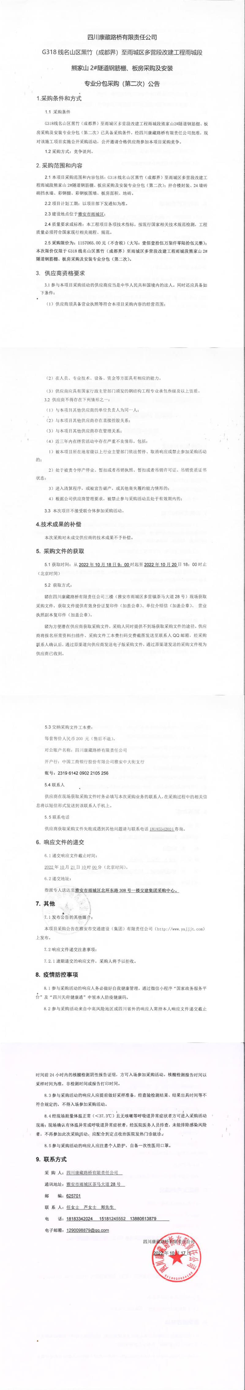 四川康藏路橋有限責(zé)任公司G318線名山區(qū)黑竹(成都界)至雨城區(qū)多營段改建工程雨城段熊家山2#隧道鋼筋棚、板房采購及安裝專業(yè)分包采購(第二次)公告
