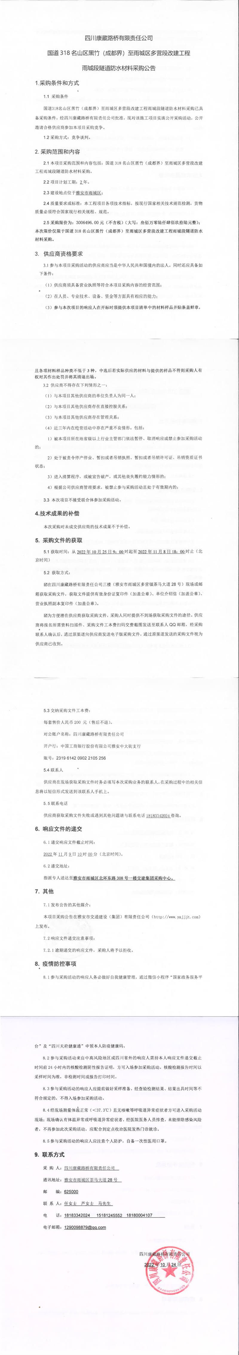 四川康藏路橋有限責任公司國道318名山區(qū)黑竹(成都界)至雨城區(qū)多營段改建工程雨城段隧道防水材料采購公告