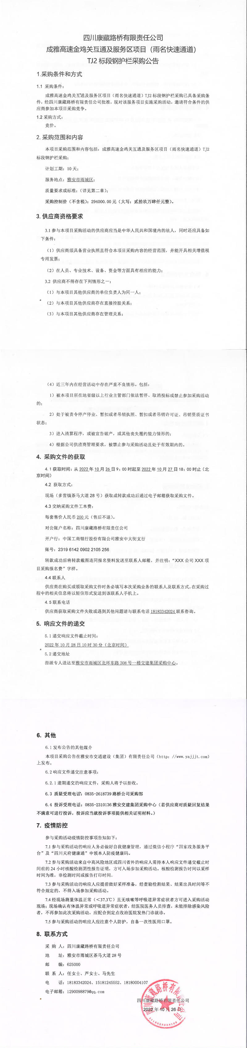 四川康藏路橋有限責(zé)任公司成雅高速金雞關(guān)互通及服務(wù)區(qū)項目(雨名快速通道)TJ2標(biāo)段鋼護欄采購公告