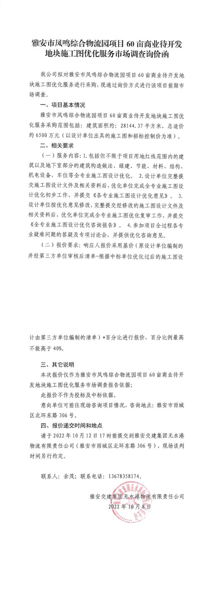 雅安交建集團(tuán)無水港物流有限責(zé)任公司雅安市鳳鳴綜合物流園項(xiàng)目60畝商業(yè)待開發(fā)地塊施工圖優(yōu)化服務(wù)市場調(diào)查詢價函