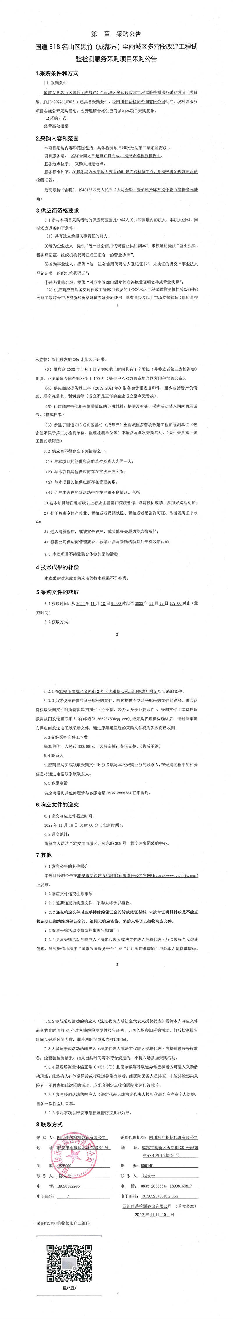 四川佳岳檢測咨詢有限公司國道318名山區(qū)黑竹(成都界)至雨城區(qū)多營段改建工程試驗檢測服務采購項目采購公告